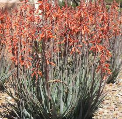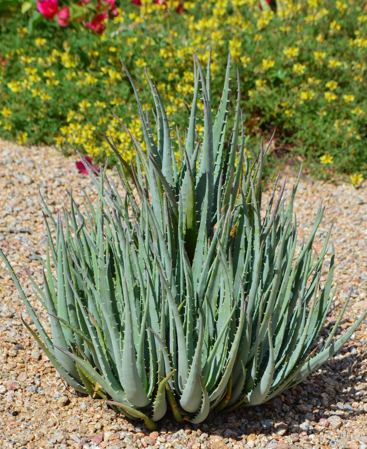 Aloe 'Blue Elf' - 5 Gallon   Size: 5 Gallon Height: 8-10" Width: 8-10" Exposure:  Sun or Partial Shade Spacing:  2-3 ft. Water Needs: Low Water Foliage: Evergreen Bloom Season:  Winter - Early Spring Bloom Color:   Coral Height (at Maturity):   2-3 ft. Width (at Maturity):   2-3 ft. Soil Preference:     Aloe 'Blue Elf' is a compact, succulent plant that is prized for its unique blue-green foliage and small size. This plant is a hybrid variety of Aloe, and is known for its tight rosettes of fleshy, triangular leaves that are arranged in a spiral pattern. The leaves are a distinctive blue-green color, with a slight glossy appearance, and are often edged in red or pink. This plant grows slowly, reaching a mature size of only 1-2 feet tall and wide, making it a popular choice for rock gardens, containers, and small spaces. Aloe 'Blue Elf' is also known for its long-lasting, tubular flowers that are produced on spikes in the late winter or early spring. The flowers are usually red or orange, adding a pop of color to the plant's foliage. This plant is easy to care for and is drought tolerant, making it a popular choice for low-maintenance gardening and xeriscaping. Aloe 'Blue Elf' is a unique and attractive plant that is sure to add interest and beauty to any landscape or indoor setting.