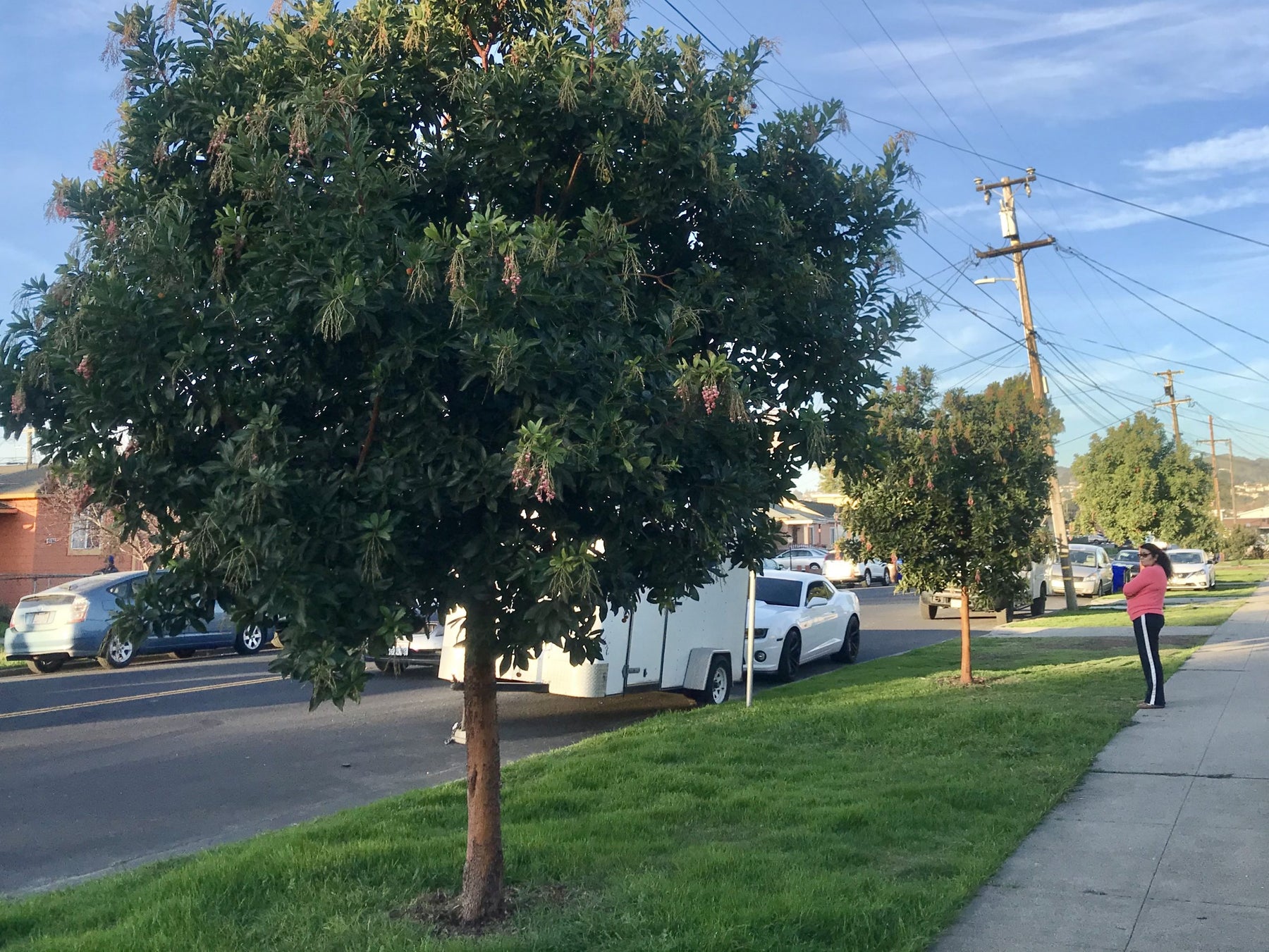 Strawberry Tree "Arbutus Marina" Standard Trunk - 24" Box Size: 24" Box Single Trunk Height: 6-8 ft. Width: 2-3 ft. Exposure: Sun Spacing: 6-10 ft. Water Needs: Regular Foliage: Evergreen Bloom Season: Bloom Color: Pink Height (at Maturity): 20-40 ft. Width (at Maturity): 20-40 ft. Soil Preference: