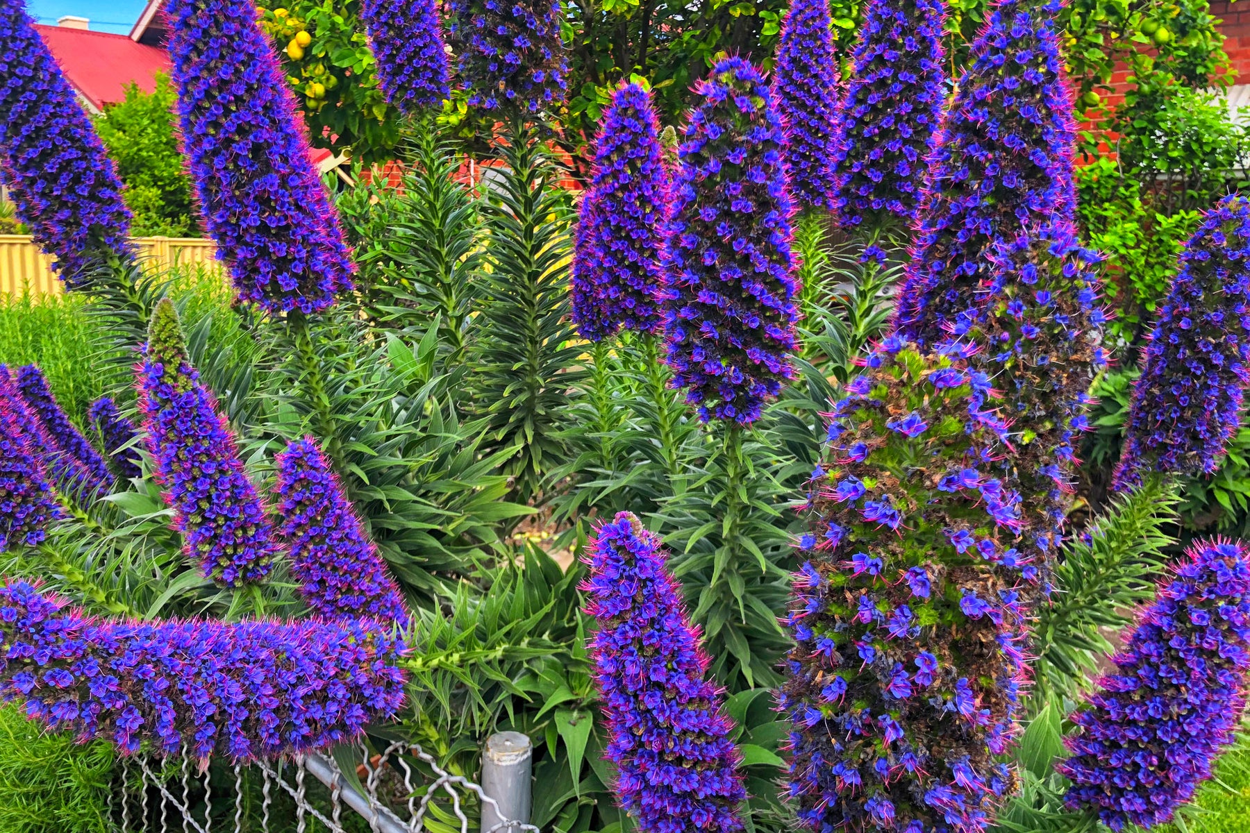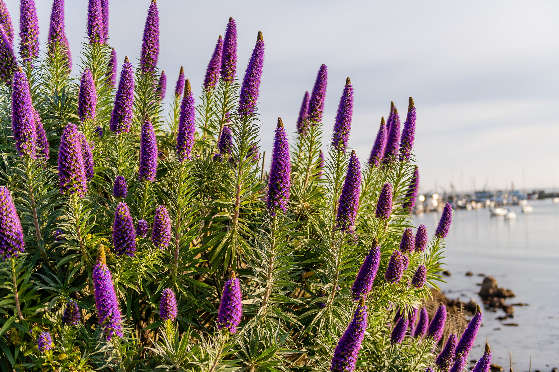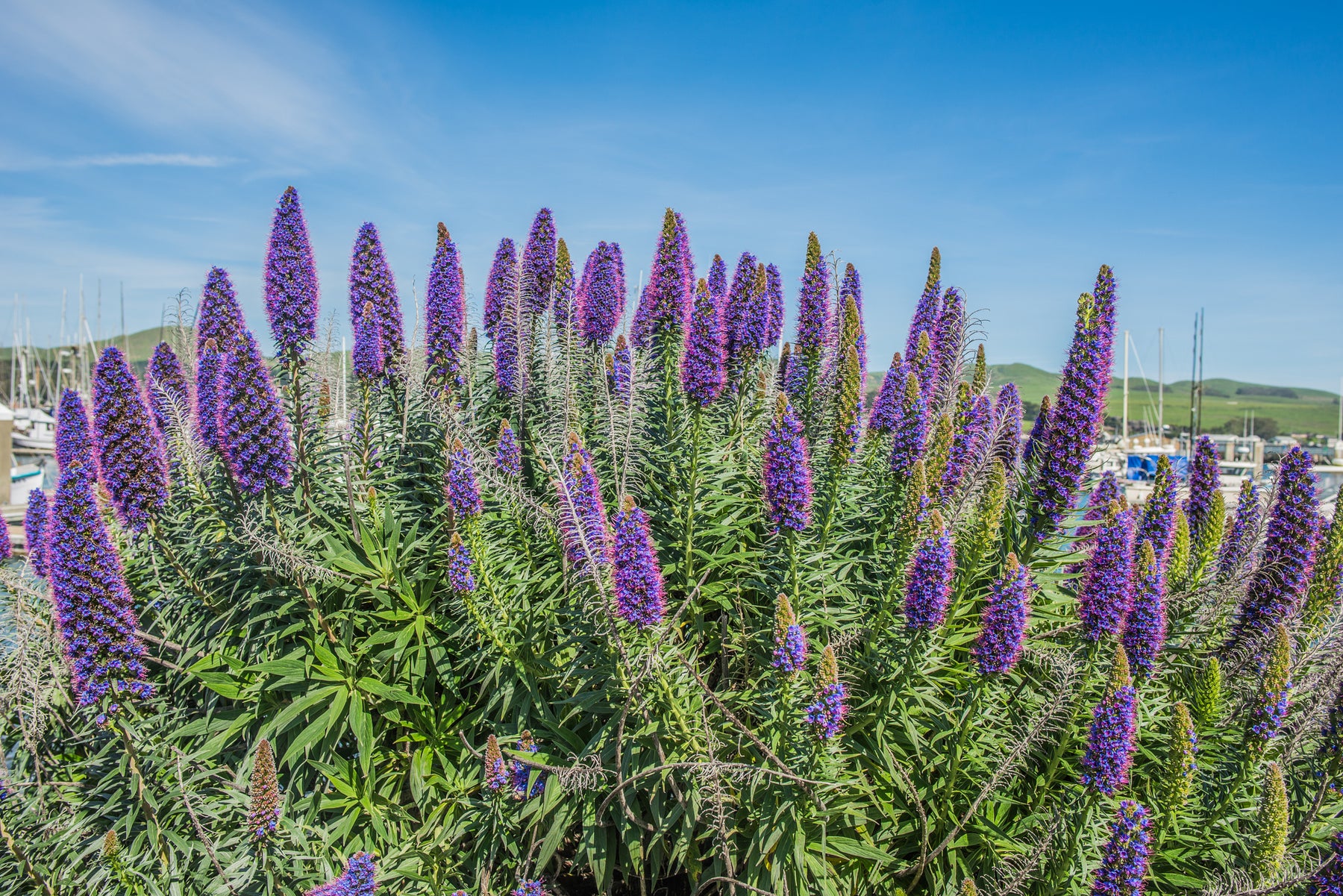 Pride of Madeira is a striking evergreen shrub admired for its dramatic, cone-shaped flower spikes covered in vibrant purple-blue blooms. Flowering in late winter through spring, the tall flower spikes rise above silvery-green foliage and attract bees, butterflies, and other pollinators. This bold plant adds strong architectural interest and color to coastal gardens, slopes, and Mediterranean-style landscapes. Highly tolerant of wind, salt spray, and drought once established, Pride of Madeira is a standout choice for low-maintenance, water-wise plantings.
