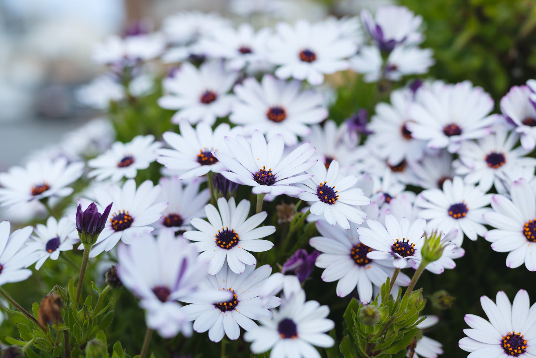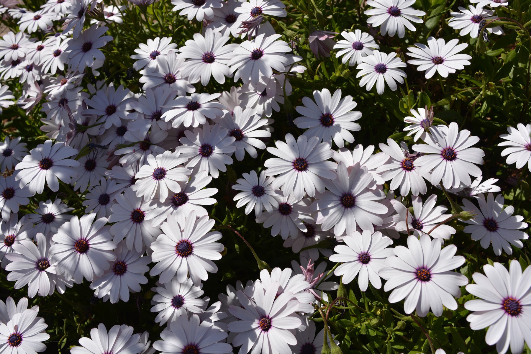 African Daisy White, Osteospermum    Size: Flat Plants per Flat: 50-60 Exposure:  Sun Spacing:  6-12" Water Needs: Low Water Foliage:  Everygreen Bloom Season:  Year Round Bloom Color: White Height (at Maturity):  6" Width (at Maturity):   6-12" Soil Preference:  Peat Moss